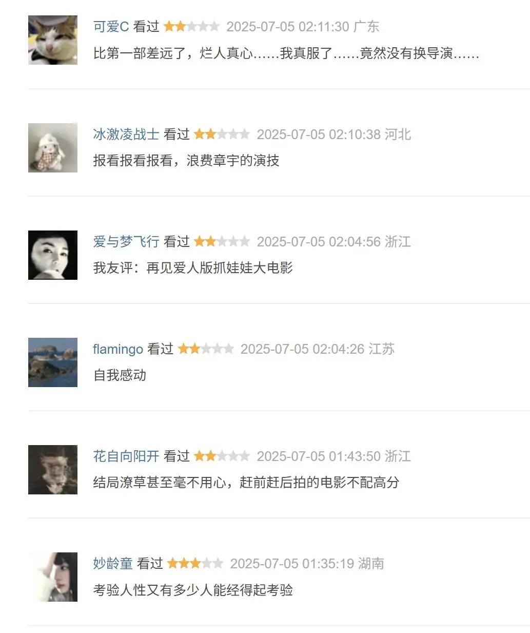 然则,7月5日认真上映后,豆瓣上的差评迅速劈头盖脸而来,电影的口碑透澈垮塌。